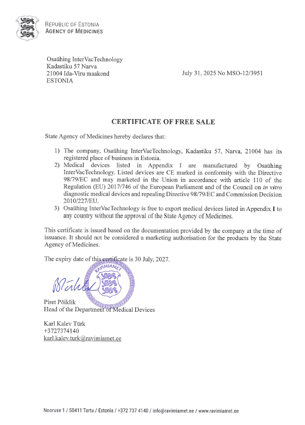 Vacuum test tubes fall under the Directive 98/79/EC of the European Parliament on in vitro diagnostic medical devices (classification “Other IVD devices”). Vacuum test tubes have CE marking, in accordance with valid requirements.